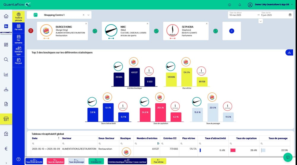 Analysez la fréquentation par magasin dans vos centres commerciaux, comparez l’attractivité, la captation et les taux de passage pour établir un classement utilisable pertinent et évolutif dans le temps.